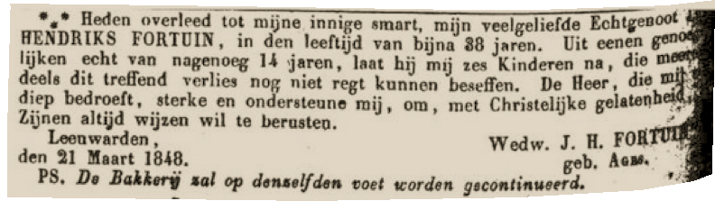 Zij zet de bakkerij onder de naam "Weduwe J.H. Fortuin", voort tot 1858.
